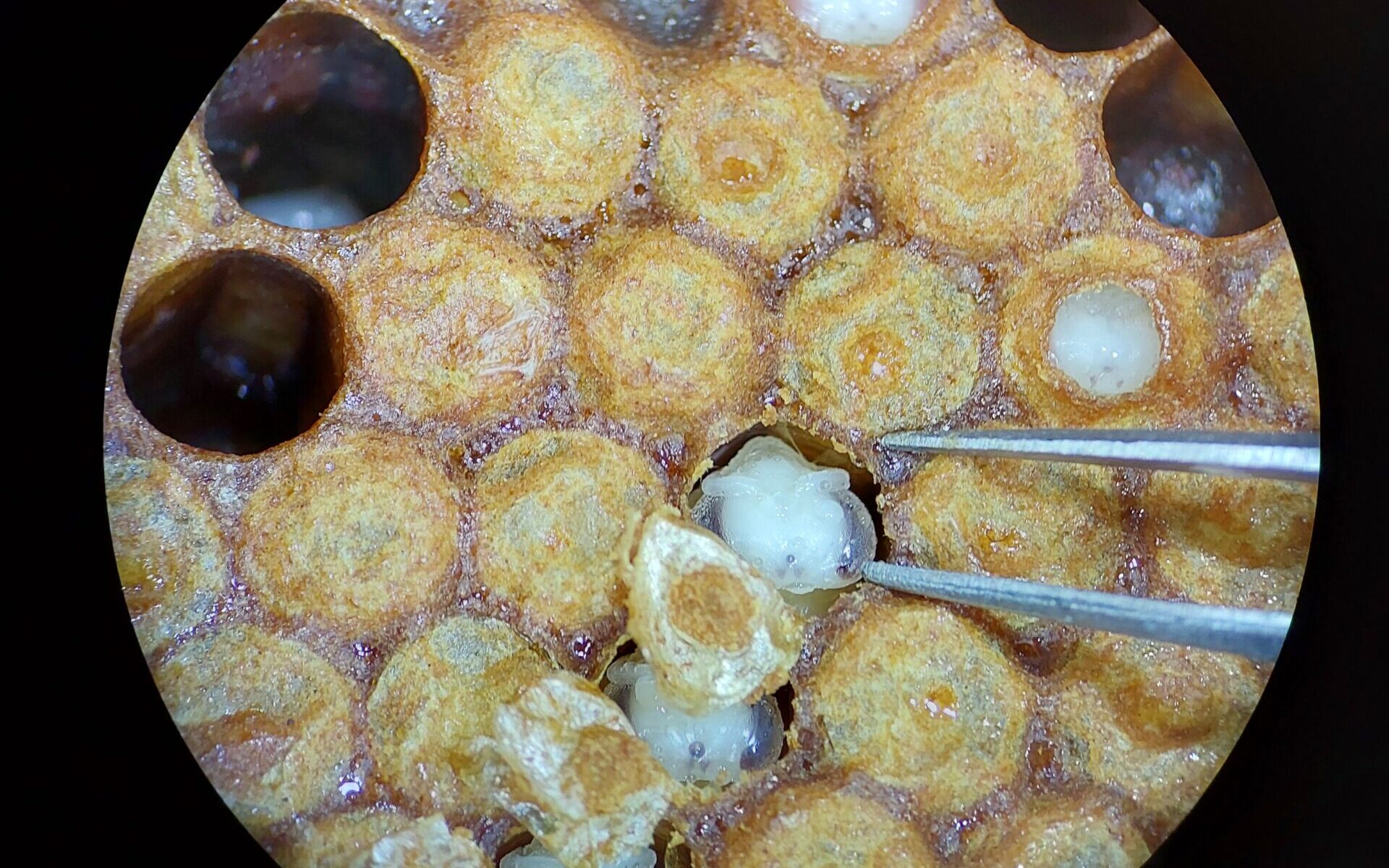 (Kuva 2025: uudelleenpeittoa(näkyy silkin osittaisena puuttumisen kannen sisäpuolella), mehiläisten itse tarkistusta varten avaamia kennoja ylempänä, sekä tyhjiä kennoja joista saastuneita toukkia on jo aiemmin poistettu )